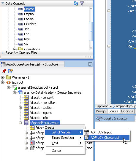 vi. Now, select the LOV, right click -> 'Inser inside' -> select 'Auto Suggest Behavior' and give value for SuggestedItems as "#{bindings.Dname.suggestedItems}".