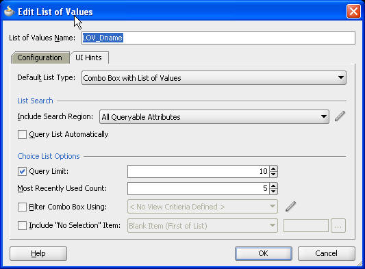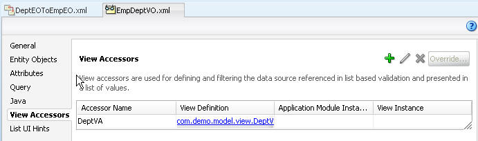 iv. Create view accessor in EmpDeptVO on DeptVO and create LOV(Combobox with List of Values) on Dname (which is in referenced entity i.e., DeptEO) attribute in EmpDeptVO.