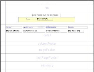 El diseño del reporte es sencillo, si desea puede agregar una imagen como logo, o tambien un rectangle que haga mas vistoso el titulo, en este caso agregare un rectangle y dentro de el colocare un static text, con el texto "AREA". Al costado de este static text, arrastrare desde el document structure el FIELD "DESAREA".