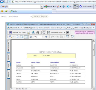 Continuando ya se tiene el archivo reporte, la clase de conexion, ahora falta la pagina que soportara el reporte, para este ejemplo ejecutaremos un reporte en pdf y al dar clic al boton "generar reporte" automaticamente debera aparecer una ventana emergente mostrando un pdf con la informacion solicitada.